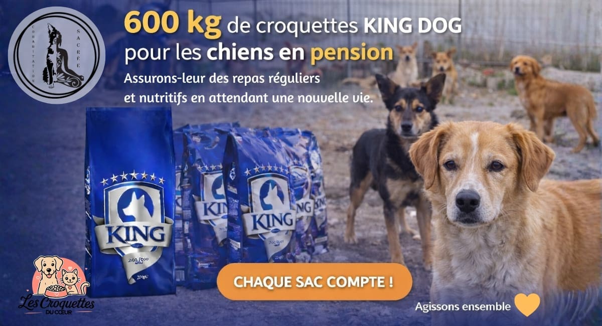 Nous lançons une nouvelle collecte de 600 kg de croquettes KING DOG afin de garantir à ces chiens des repas réguliers, équilibrés et suffisants le temps qu’ils trouvent une solution durable.